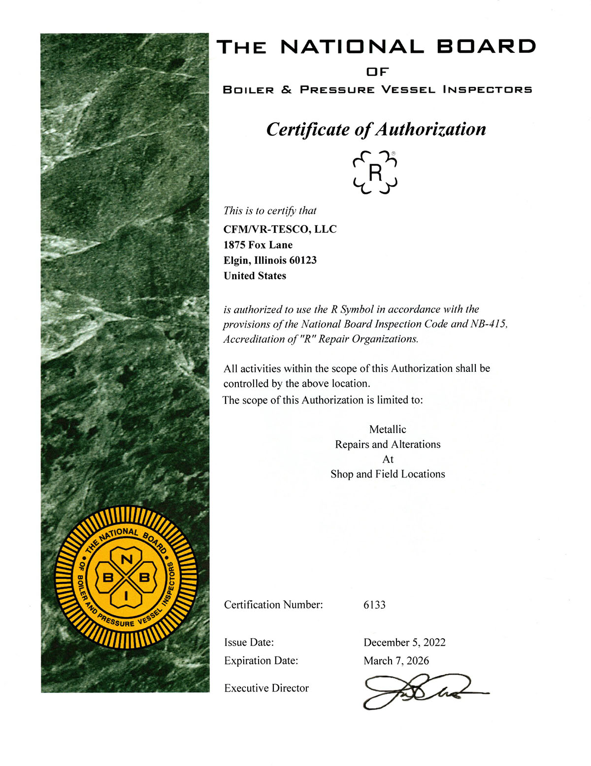 At CFM/VR-TESCO, LLC, everything begins and ends with the quality of our products and services. We understand that components which are not repaired to the correct specifications can cause delays – or worse – for your business. That's why we place such a high priority on the training and skills development of our craftsmen who must perform up to the rigid quality assurance standards that we set for ourselves as a company, which align with the programs outlined by the National Board Inspection Code and the American Society of Mechanical Engineers.